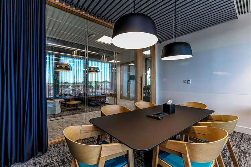 照明方案采用了多種光照的組合形式,以創(chuàng)建自然日光的感覺(jué)。對(duì)于技術(shù)部門來(lái)說(shuō),重要的是照明不能太高科技感或像一個(gè)大燈箱,因此這里使用了軌道照明代替漫射器和聚光燈。會(huì)議室以吊燈為主,突出與會(huì)人員的面部照明,以及屏幕上方用于遠(yuǎn)程通話的燈光,因此,需要更專業(yè)的照明設(shè)計(jì),以清晰、明亮的映襯和傳遞人物形象。