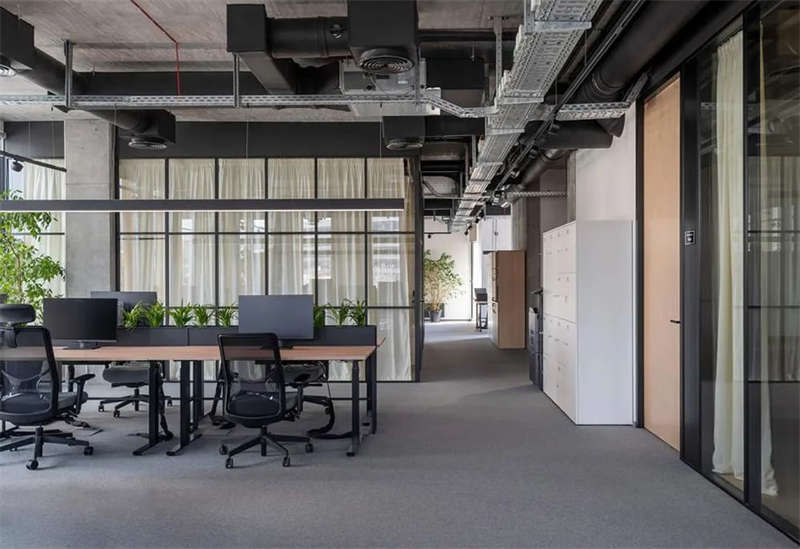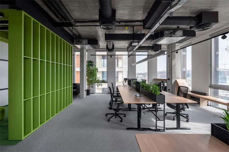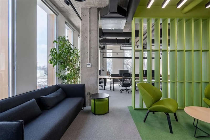 開放式空間因?yàn)榇┎辶舜罅康臅?huì)議室而被分隔成若干小型區(qū)域;而那些由此形成的開放協(xié)作區(qū)則被賦以清新的色彩,強(qiáng)調(diào)其功能特性的同時(shí)也營(yíng)造出一個(gè)活力多彩的空間表情,與此同時(shí),這些空間也與其它區(qū)域一樣保持同樣的工業(yè)觸感和一致的基調(diào)。