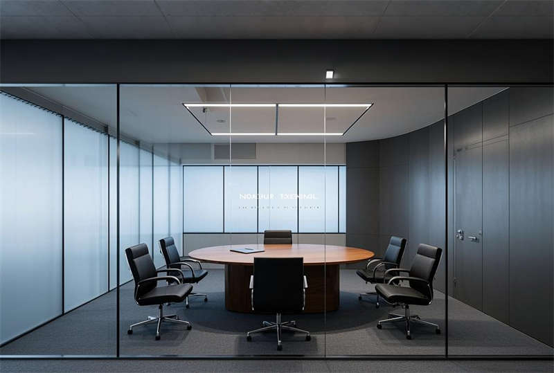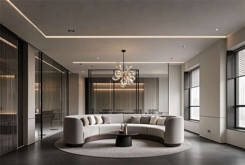 本方案采用現(xiàn)代簡(jiǎn)約設(shè)計(jì)語(yǔ)言,整體空間以淺灰、白、原木三色為主基調(diào)。前臺(tái)區(qū)設(shè)置懸浮式接待臺(tái)與發(fā)光LOGO墻,搭配LED線性照明塑造企業(yè)形象。開放式辦公區(qū)采用模塊化工位布局,通過(guò)玻璃隔斷劃分功能區(qū)域,保證自然采光最大化的同時(shí)提升空間通透感。智能會(huì)議系統(tǒng)集成于各會(huì)議室,配備電動(dòng)投影和書寫玻璃墻。經(jīng)理室采用深藍(lán)色烤漆木飾面提升商務(wù)質(zhì)感,休息區(qū)設(shè)置咖啡吧與卡座強(qiáng)化員工關(guān)懷。走廊運(yùn)用導(dǎo)視燈帶串聯(lián)各區(qū)域,茶水間六角地磚增添趣味性。培訓(xùn)室階梯式布局配合吸音墻面確保聲學(xué)效果,電話間磨砂玻璃立方體兼顧隱私與采光。VIP室智能霧化玻璃實(shí)現(xiàn)空間靈活轉(zhuǎn)換,整體設(shè)計(jì)注重功能分區(qū)與人文關(guān)懷的平衡。