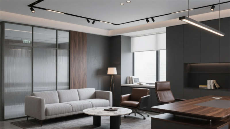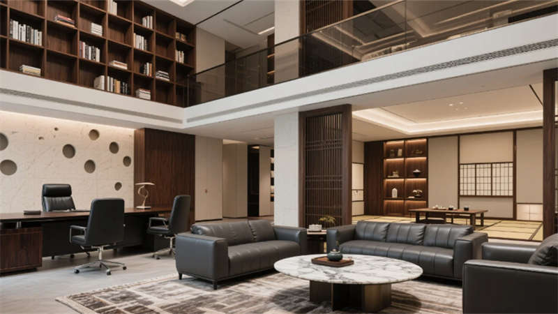 高管辦公區(qū)通過灰玻與豎向木紋鋁材構筑半私密空間,L型胡桃木辦公桌與深棕真皮座椅彰顯商務質感,獨立閱讀角的落地燈營造人文氛圍。總裁辦公室運用懸浮式書架墻與黑檀木辦公桌塑造權威感,環(huán)形皮革沙發(fā)組與天然大理石茶幾構成高端會客場景,日式茶室通過木格柵與洞石墻面實現東西方美學交融。