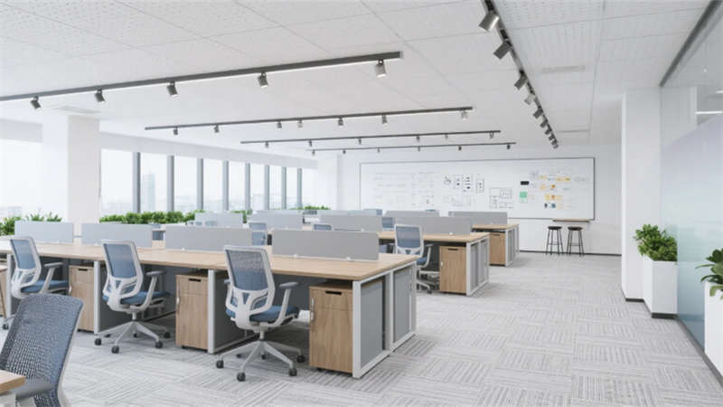 企業(yè)大堂延續(xù)外立面色系,雪花白大理石地面與深灰導視帶構建空間骨架,曲面木紋石背景墻通過背光企業(yè)標識形成視覺焦點,漸變鋁方通吊頂的線性光帶引導人流走向。開放式辦公區(qū)以灰橡木辦公模塊為核心,沖孔鋁板吊頂整合軌道射燈系統,漸變霧化玻璃隔斷內置綠植槽,編織紋地毯有效降低行走噪音。