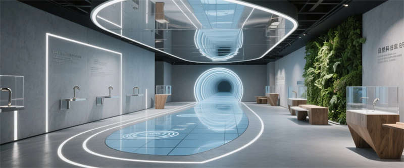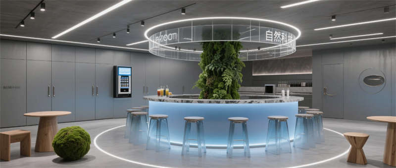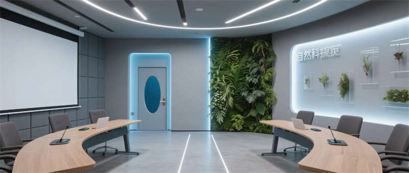 各區(qū)域通過四大統(tǒng)一性語言緊密串聯(lián):霧霾藍橢圓金屬門把手貫穿全空間,再生材料家具呼應(yīng)可持續(xù)發(fā)展理念,聲學(xué)墻面嵌入本地植物標(biāo)本強化生態(tài)屬性,智能燈光系統(tǒng)則通過4000K色溫線性燈帶實現(xiàn)晝夜場景的無縫切換。特別設(shè)計的全息投影展廳智能階梯會議室,通過LED交互地屏與AR懸浮展臺,將品牌科技基因融入空間體驗。