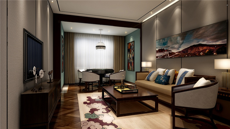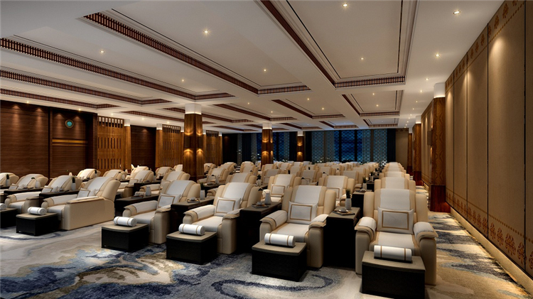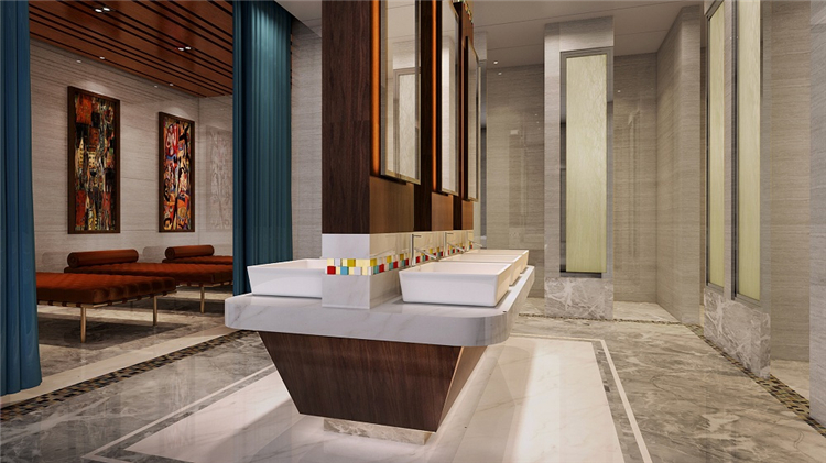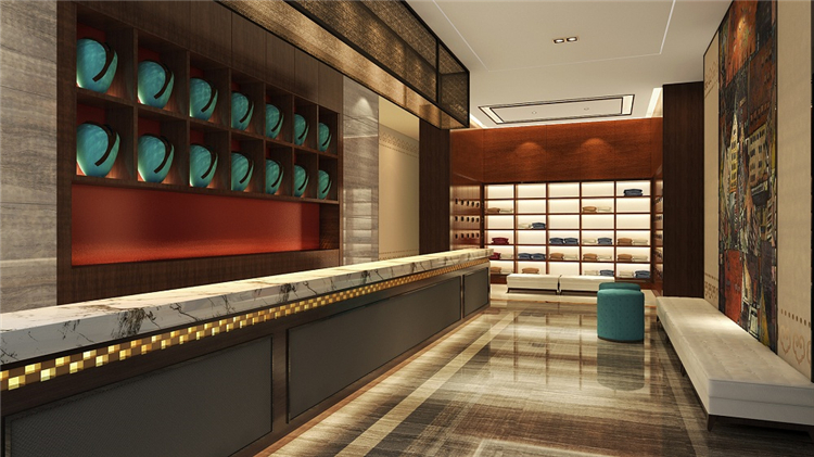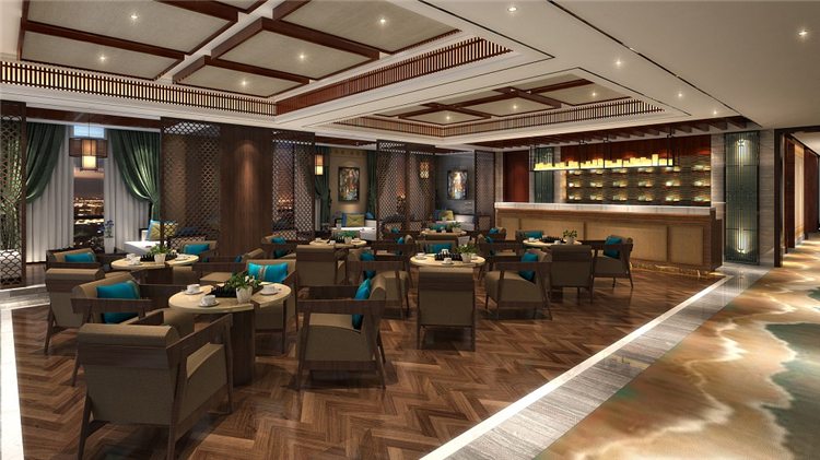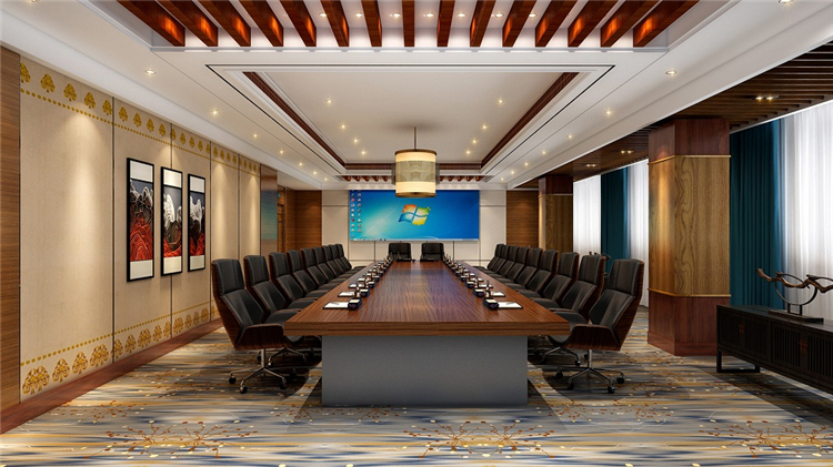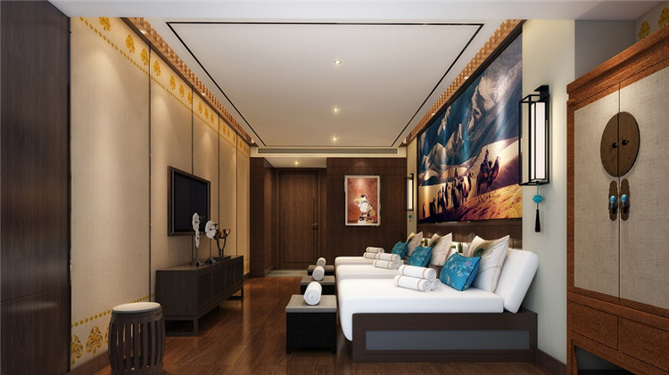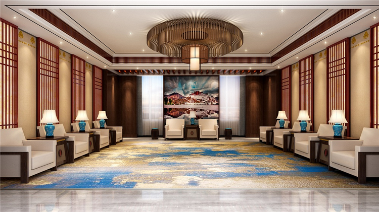 設(shè)計師同時考慮到地域民族文化和功能實用性,結(jié)合現(xiàn)代簡約與傳統(tǒng)藏式風格,為往來的游客提供一個放松休憩的完美場所。設(shè)計師主要運用藏藍、金黃、喇嘛紅等濃重色彩進行搭配,靈感既來自于藏族傳統(tǒng)文化及宗教藝術(shù),也來自于雪域高原山高天藍水長花艷的自然景觀。借用柱網(wǎng)結(jié)構(gòu)、幾何紋路、吉祥花等藏式建筑形式和圖案進行裝飾和點綴,但將繁復(fù)的式樣盡量精簡平面化,取其古樸、神奇、粗獷的神韻,表達一種平衡、對比、和諧統(tǒng)一的構(gòu)圖規(guī)律和審美思想。