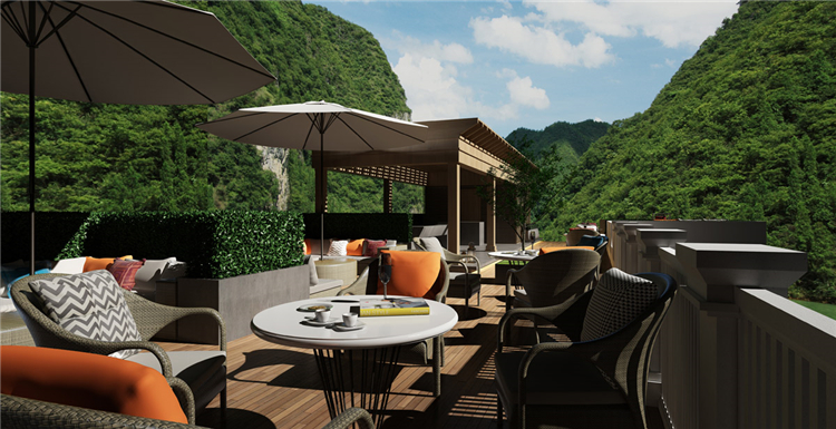 本案度假酒店設(shè)計(jì)依山傍水,設(shè)計(jì)師在規(guī)劃時(shí),充分考慮到自然環(huán)境帶給酒店的附加值。設(shè)計(jì)方案時(shí),設(shè)計(jì)師就將部分功能區(qū)規(guī)劃到室外露天場(chǎng)地,當(dāng)然在室內(nèi)設(shè)計(jì)中也充分利用了自然采光的設(shè)計(jì)手法,讓整個(gè)度假酒店與自然環(huán)境融為一體。