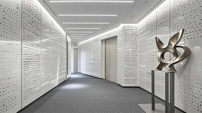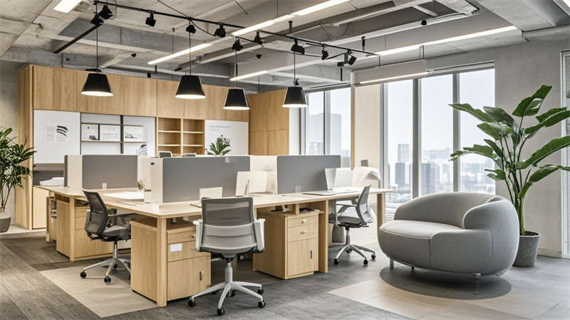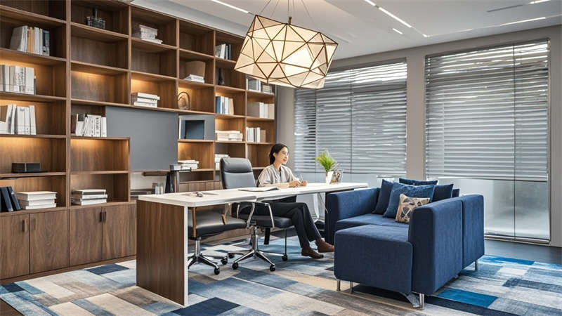 辦公區(qū)采用模塊化布局,配置智能升降桌和人體工學椅,裸頂噴灰工藝結合軌道燈系統(tǒng)實現(xiàn)靈活照明。色彩體系以高級灰為基底,搭配原木色系緩解視覺壓力,局部采用深藍跳色增強空間層次。材質(zhì)運用注重環(huán)保性能,墻面大量使用穿孔吸音鋁板,地面采用防滑地膠與靜音地毯組合。