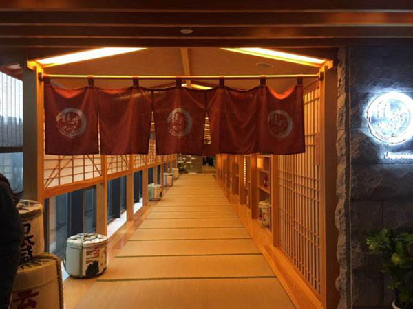 通常是門口有一個(gè)3段式,或者是4段式的暖簾,寫(xiě)上自己的店名,中文日文,或者是其他,然后通向廚房的門口掛上一個(gè)暖簾。