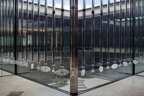 細致的從空間注入圓、點、線,繁縟而有節(jié)配上雅致玻璃吊飾,自然光映出流光溢彩,水的意象呈現(xiàn)東方肌理,光影交織突顯五重院落的建筑,彰顯東方大境。