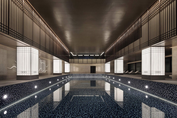 湛藍的泳池乃山水縮影,點、線、面,展現(xiàn)層巒疊嶂的山脈驟然輕盈,山水觸手可及。