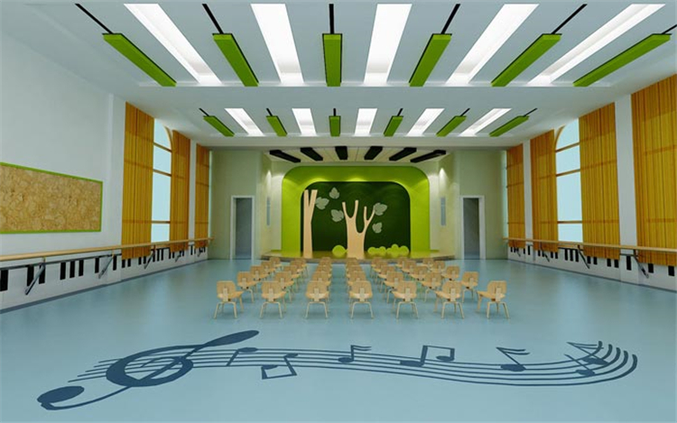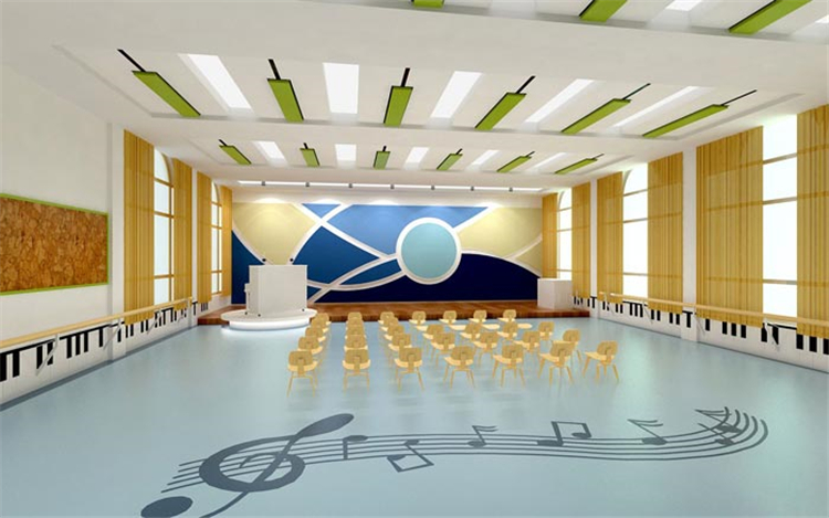 表演區(qū)域的設(shè)計(jì):這是最后一個(gè)音樂(lè)教室,但是這個(gè)教室在屬性上與前兩個(gè)稍有不同,在滿(mǎn)足音樂(lè)教室的同時(shí),也滿(mǎn)足表演的需求,設(shè)計(jì)師希望每一個(gè)孩子都是一個(gè)表演家,在臺(tái)上可以盡情的表演,培養(yǎng)每一個(gè)孩子表演、演講的能力。