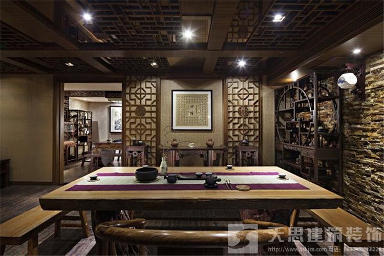 古典中式裝修茶樓會所空間裝飾有極強(qiáng)的設(shè)計(jì)感,高低錯落的掛畫與格柵窗落增加茶室的藝術(shù)美,原色原味的樹根茶幾集實(shí)用與欣賞一體,泡一杯清茶,就進(jìn)入了一片碧綠的天空,這里將成為愛茶人士的最愛。