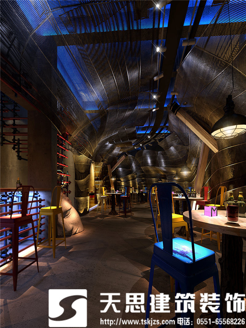一層吧臺(tái)處,方鋼構(gòu)建的造型樹自由,飄逸,充滿藝術(shù)張力。鋁制吧臺(tái)搭配特制的建筑腳手架座椅,工業(yè)范兒十足,還原了建筑的純粹美感。鋼板樓梯處用射燈做呼應(yīng),浪漫且工業(yè)氣息濃郁。通道處,玫瑰金鋼板勾勒的點(diǎn)點(diǎn)星光自由浪漫,展現(xiàn)了工業(yè)元素的獨(dú)有魅力。包間,原有紅磚墻處理后的墻面中性硬朗,鐵網(wǎng)做成的遮擋裝飾飄逸自由,營(yíng)造的私密效果恰到好處。玻璃上的手繪勾勒出包間裝飾畫,讓視角多了一絲抽象派的趣味。