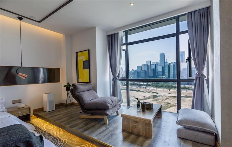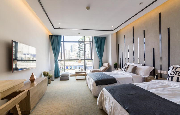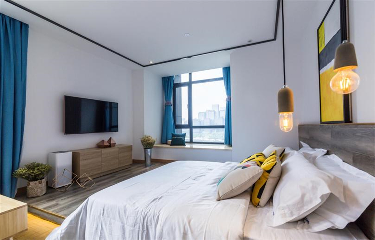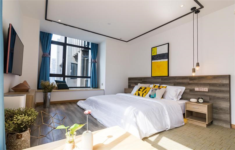 溫馨、小資、賓至如歸是本案設(shè)計(jì)的一條主線。大面積的墻體刷白,不做墻面大面積包裝,簡(jiǎn)簡(jiǎn)單單,讓空間更溫馨;配以部分水泥墻面做一個(gè)灰色系的穿插,讓空間在白的基礎(chǔ)上得以小范圍的格調(diào)提升,配上顏色稍微跳躍的畫及床品,視覺(jué)得以輕微的沖擊,不那么刺眼,更多的搭配原木木制品讓人更親近自然,讓客人感覺(jué)舒適,如歸家般放松。