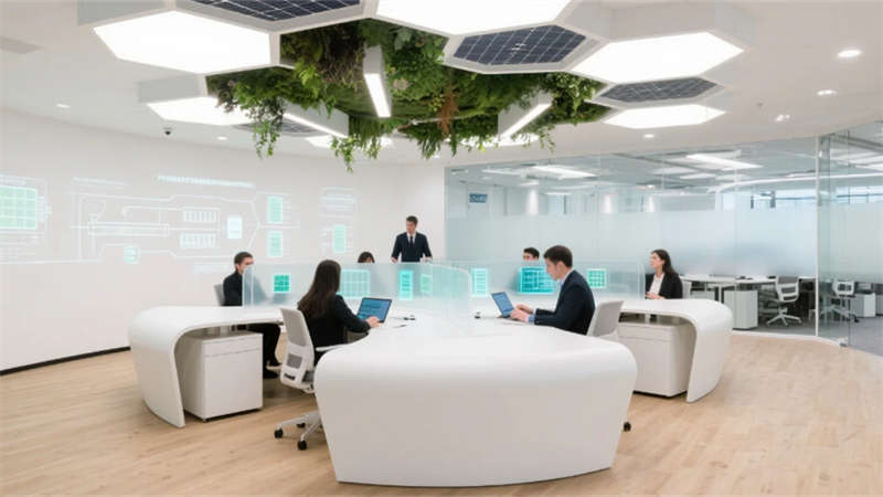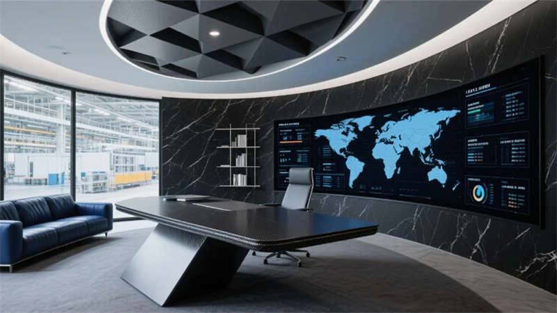 開放式辦公區(qū)打破傳統(tǒng)壁壘,蜂窩狀工位與懸浮綠植裝置詮釋靈動協(xié)作,透明屏幕上的數(shù)據(jù)流與玻璃隔斷投影的生產(chǎn)流程圖虛實(shí)相映??偛每臻g則如懸浮的智慧中樞,弧形落地窗將車間全景化作動態(tài)壁畫,金屬與大理石的碰撞間,流淌著決策與創(chuàng)新的電流。智能倉儲區(qū)立體貨架的金屬骨骼間,無人機(jī)如蜂鳥般掠過貨品,天光與電子標(biāo)簽的光斑在環(huán)氧地面上跳動著數(shù)字時(shí)代的韻律。