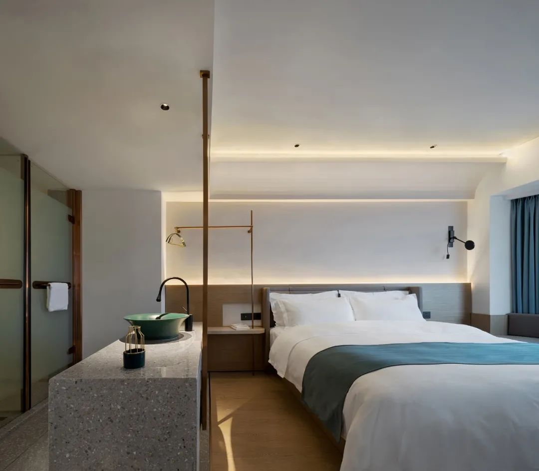 在線條曲度與建筑結(jié)構(gòu)的銜接中交融出感性層面的驚喜,令入住者“循著光”下榻酒店,在體驗(yàn)與感受中為空間注入當(dāng)下的即時(shí)形態(tài),由此,人在空間里是造訪者亦是著境者,是觀賞者,亦是參與者。情與境中,無(wú)盡遐思。