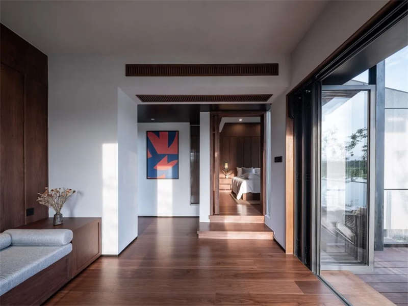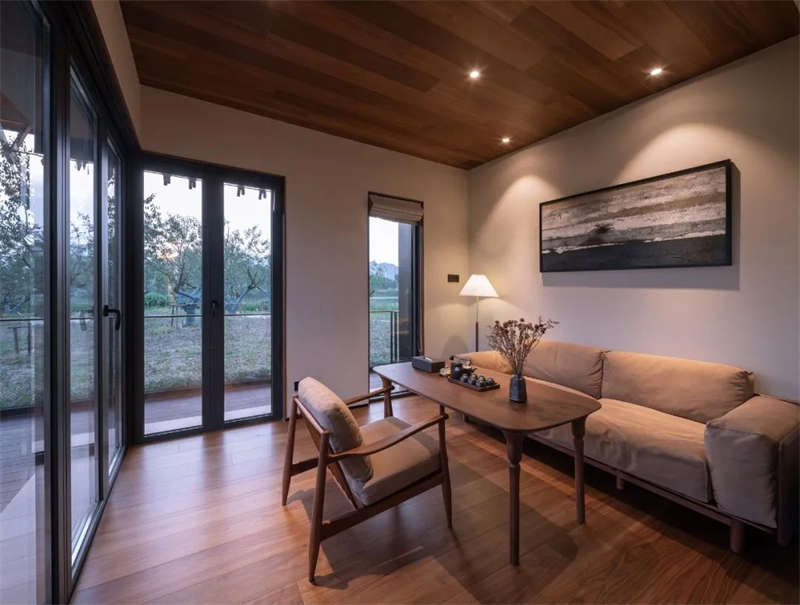 兩個客房的室內(nèi)格局不太相同,其中一個戶型是室內(nèi)空間非常緊湊的,而室外則有一個非常大的露臺,室內(nèi)只是滿足基本的居住需求,大部分時間可以在戶外感受自然,靜賞湖光山色。形態(tài)關系上兩片大的三角雙坡屋頂蓋住了整個房間,屋頂呈一頭起翹狀態(tài),立面全玻璃通透,而大屋蓋又限定了室內(nèi)看出去的視野范圍和方向。室內(nèi)空間由中間的衛(wèi)生間一分為二,分為了睡眠區(qū)和休閑區(qū),空間左右對稱,中間衛(wèi)生間體量不到頂,整個屋頂空間連續(xù)可見。大露臺上設置了一個休閑喝茶區(qū)和戶外泡澡浴缸,臨水設計了無框玻璃欄板讓視線盡量少的被遮擋。