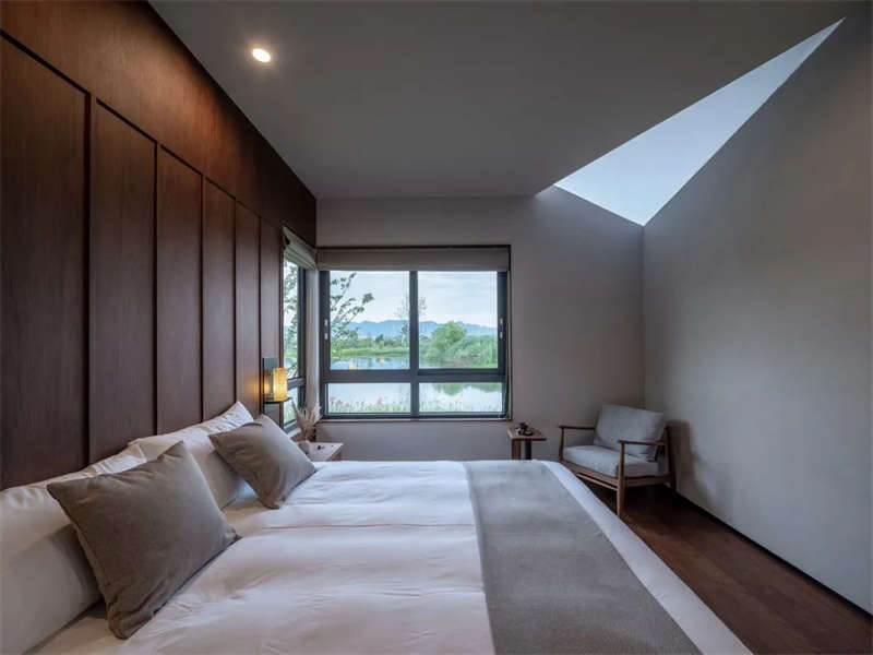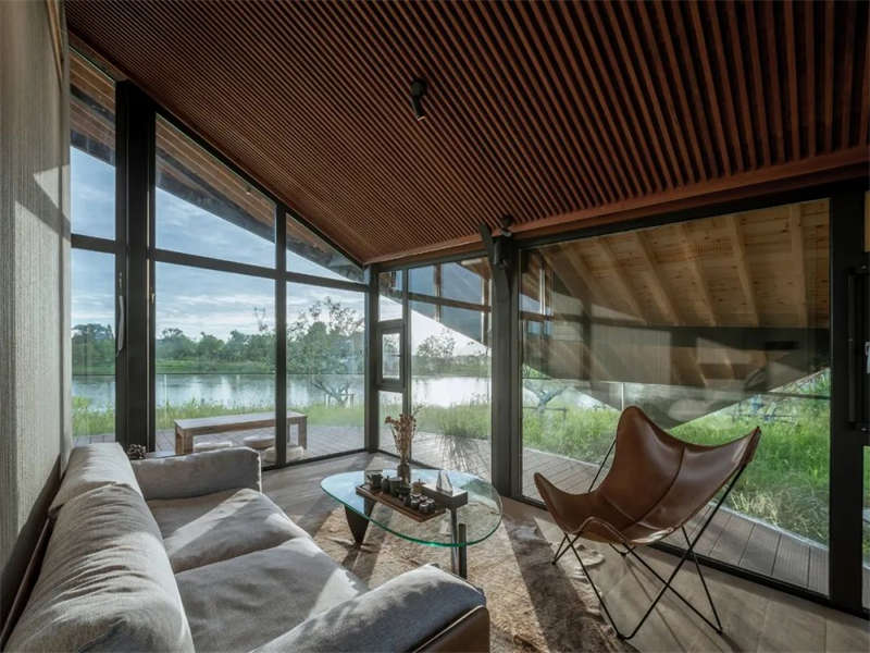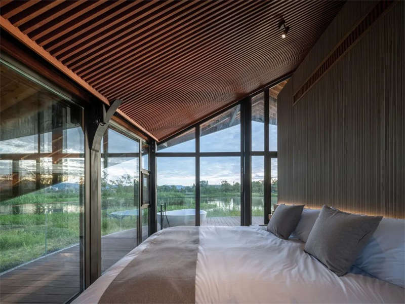 在界面考慮上,客廳設置了可全部移開的轉(zhuǎn)角落地窗,全部打開之后濕地的湖面水生植物露臺室內(nèi)就全部融為一體了,這時打開入戶門還會有穿堂風,空間很舒服,臥室設置在為一個高起來兩級踏步的空間體量中,有趣的是臥室頂上開了一個三角窗,在床上可以透過三角窗看到屋頂?shù)哪緲?gòu)架和天空,衛(wèi)生間體量則布置在背面,與臥室連接,在大浴缸邊上設置了可全部開啟的落地門窗,泡澡時可以全部打開,有一種在戶外泡澡的體驗,衛(wèi)生間外面還有一個露臺,泡完澡之后可以到露臺上坐坐休息。