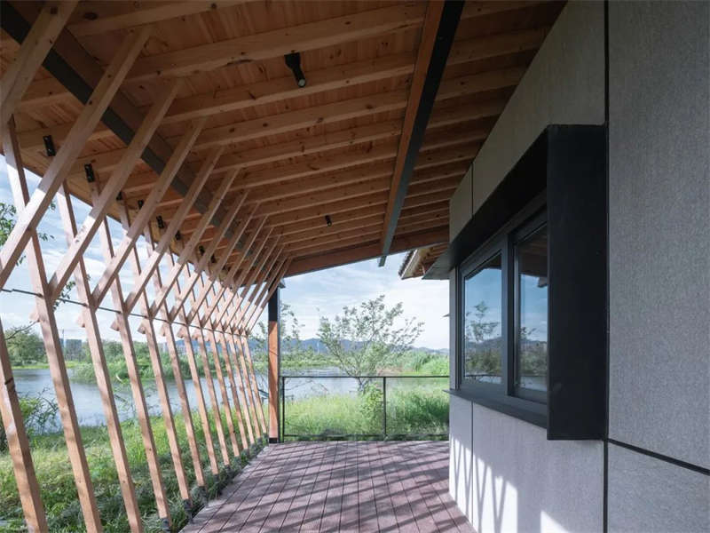 濕地生態(tài)酒店由兩個客房類型有機打散分布組成,都是運用了在大屋頂下生活的概念,大屋頂也像是翅膀,如小鳥般棲居于此,在島上停留片刻,輕輕落在水面上。古人造物很喜歡因地制宜,輕巧的介入自然,用木頭把房子架在水上,房子被自然融入與包裹,這種生態(tài)觀念在中國人的骨子里就一直存在。很多人會說這兩個房子很有江南的味道,這種江南性一方面在于對房子虛體空間屬性的理解,放大檐下空間的比例,連接人居空間與自然天地,同時通過對尺度的把握創(chuàng)造怡人的居住空間,皆是營造一種人、空間、自然三者之間的關系。