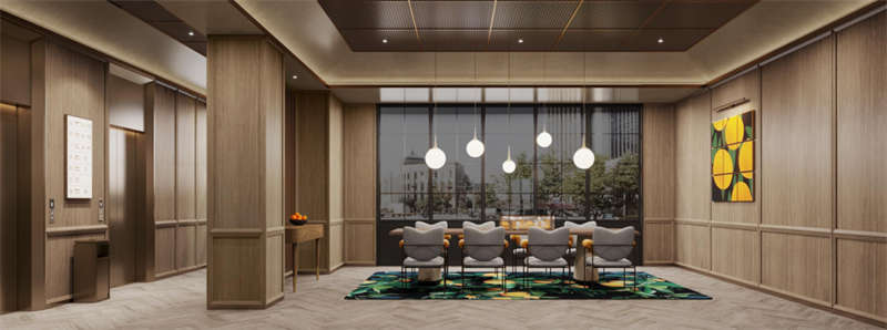 健身房、洗衣房和會(huì)議室旨在滿足游客的多功能需求。同時(shí),它們的設(shè)計(jì)也與空間風(fēng)格和視覺美感相對(duì)應(yīng)。統(tǒng)一的木飾面作為空間底座,運(yùn)動(dòng)紋地膠和定制彩紋點(diǎn)綴健身房的生機(jī)與活力。精致的水磨石桌面、咖啡乳膠漆和方形形式的活力圖案地膠為洗衣房增添了柔和感,而開放式會(huì)議室的簡約風(fēng)格則是綠色墻布和定制的博龍地毯的產(chǎn)物。