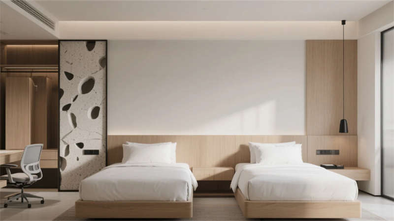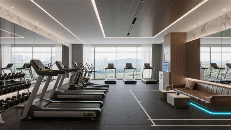 客房以中性色調(diào)為基底,亞麻、柚木與肌理墻面營造松弛感,智能化系統(tǒng)隱于無形,從電動紗簾到無線充電桌,細節(jié)中滲透科技溫度。雙床房的可移動屏風與定制家具,兼顧私密與靈活;衛(wèi)浴空間以霧面玻璃與水磨石打造朦朧質(zhì)感,啞光五金件點綴現(xiàn)代精致。餐廳以共享長桌與綠植墻激活社交氛圍,水磨石地面鑲嵌的黃銅線條如溪流蜿蜒,呼應(yīng)徽派建筑中的流水意象。健身房鏡面與橡膠地面反射城市燈火,休憩區(qū)的皮質(zhì)軟榻與漸變燈光,為運動后提供片刻寧靜。
