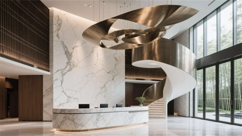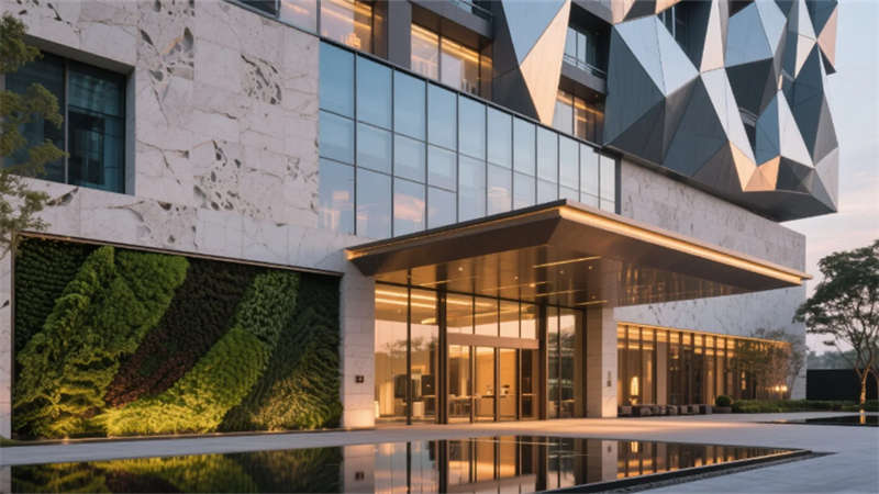 這座酒店以自然與人文的共生為靈感,將徽州山水意境凝練于現(xiàn)代設(shè)計語言中。建筑外觀以幾何切割的洞石立面與通透玻璃幕墻交織,垂直綠植如水墨筆觸般攀附墻體,入口處鏡面水景倒映天光云影,模糊建筑與自然的邊界。步入大堂,挑高空間內(nèi)懸浮的螺旋樓梯與抽象金屬裝置形成動態(tài)視覺焦點,暖木格柵與冷冽大理石碰撞出靜謐與奢華的平衡,全景窗將庭院竹林景觀引入室內(nèi),光影隨時間流轉(zhuǎn)而變幻。