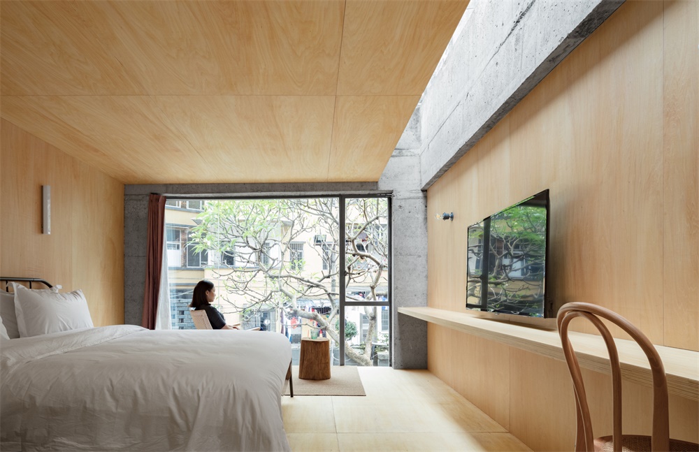 建筑四周圍繞著老式居民樓,為了使其呼應周圍居住環(huán)境的氛圍,特意保留了原有立面具有歷史質(zhì)感的青磚。此外,在外立面的門窗的位置和進深的設計上,結(jié)合整個建筑比例和室內(nèi)布局以數(shù)十厘米為單位進行了微調(diào),使得室內(nèi)視野開敞且采光充足。金屬窗框的更換和進深的加深則為民宿增添了空間浸入感。