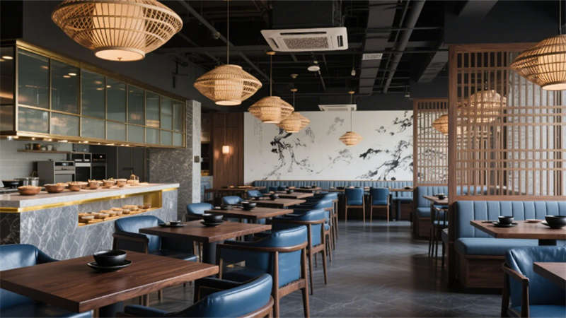 步入大堂,深胡桃木墻面與淺灰石材地面構成經(jīng)典東方底色,水墨藝術玻璃屏風似山巒疊嶂,懸浮竹編吊燈以編織肌理軟化空間。靛藍色沙發(fā)與黃銅細節(jié)的點綴,既延續(xù)外立面色彩邏輯,又激活視覺層次。餐飲空間延續(xù)木格柵語言,竹編燈罩與黑陶器皿在開放式廚房的金屬框架中碰撞,演繹“新舊共生”的餐飲儀式。