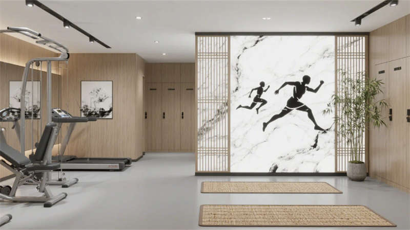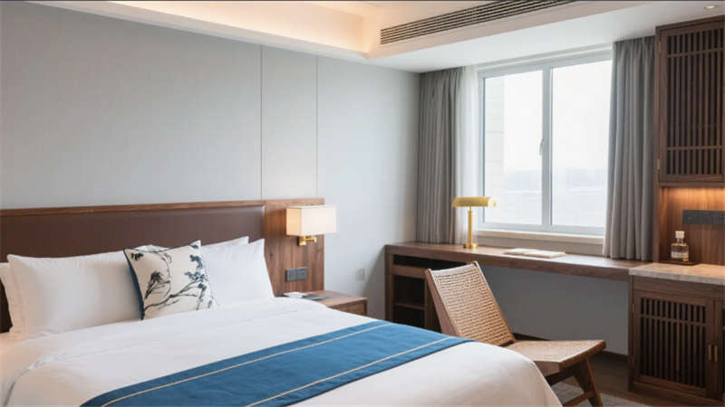 客房區(qū)域以“去符號化”手法詮釋東方美學:深木紋床頭背板嵌入隱晦的水墨紋樣,藤編躺椅與迷你吧木格柵柜體,在3000K暖光中營造居停的松弛感。套房通過絲絨沙發(fā)與抽象水墨畫提升奢華調(diào)性,浴缸區(qū)的竹藝卷簾巧妙平衡通透與私密。公共空間亦貫徹統(tǒng)一語匯——健身房竹編地墊與水墨運動壁畫、走廊絹絲燈箱與枯山水景墻,皆以現(xiàn)代材質(zhì)轉(zhuǎn)譯傳統(tǒng)元素。