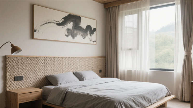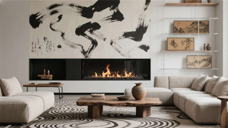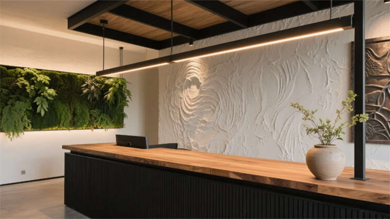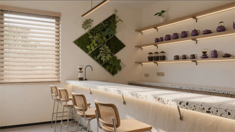 步入大廳,弧形亞麻沙發(fā)與編織地毯圍合出松弛場域,整面落地窗借景庭院竹影,琴葉榕與懸浮綠植墻形成立體生態(tài)敘事。多功能區(qū)以巢湖水波紋地毯呼應(yīng)地域脈絡(luò),壁爐旁的非遺火筆畫裝置暗藏城市文化密碼??Х劝商倬幾闻c水磨石臺面碰撞,幾何綠植墻在百葉光影中演繹晨昏詩意。