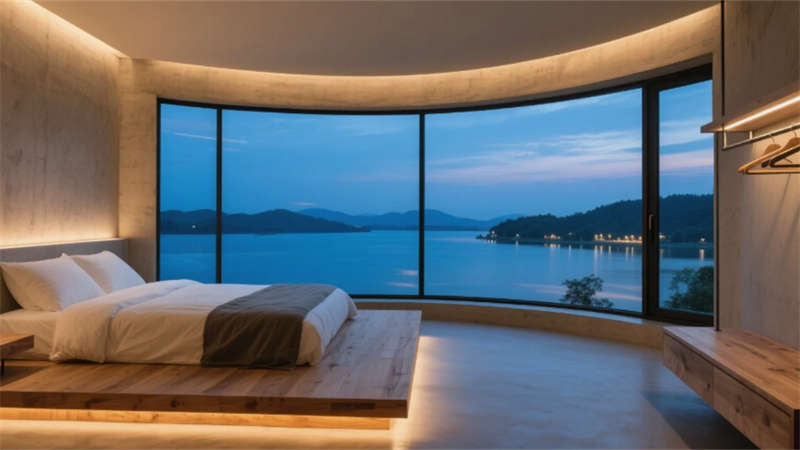 客房設(shè)計強調(diào)“無界觀景”,全景落地窗收納合肥天際線,懸浮原木地臺床與混凝土浴缸構(gòu)成侘寂美學(xué)。景觀房270°玻璃幕墻將城市燈火化為動態(tài)背景,微水泥墻面與亞麻織物撫平喧囂。