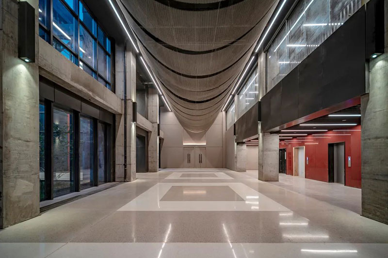 低飽和度紅色鋼板與黑色鋼板形成視覺(jué)碰撞,銹板前臺(tái)、懸浮燈飾與金屬結(jié)構(gòu)架讓空間闊達(dá)簡(jiǎn)練,通高的玻璃幕墻借景舊建筑的殘影,使之成為室內(nèi)裝飾的一部分。