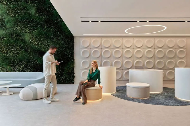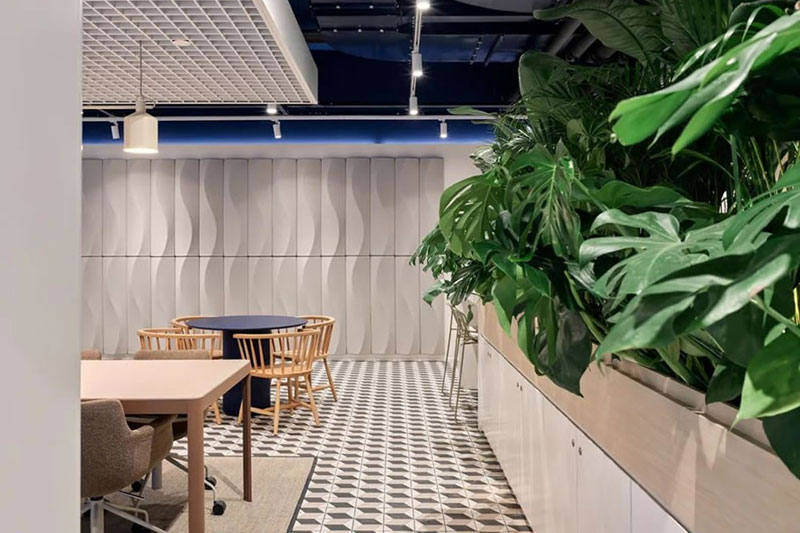 開放協(xié)作、動靜相容、靈活多元(寧靜的工作區(qū)、舒適的休閑區(qū)、開敞多元的社交區(qū)和協(xié)作區(qū)),建立在ABW基礎上的超強適應性空間規(guī)劃支持人們多樣化的工作需求。簡約溫馨的配色,加以韻律感的元素重復應用,以及隨處可見的大量綠色植物,讓整個空間在恬靜溫婉中又洋溢著靈動的韻致。