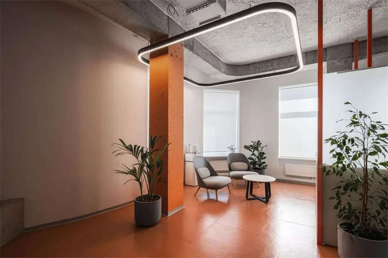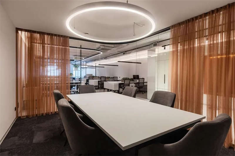 一種是沿辦公室周邊設(shè)置了一圈燈帶,燈光從白色天花板上反射出來,散發(fā)出令人賞心悅目的溫暖漫射光。還有一種線性照明形式呼應(yīng)流線型的建筑輪廓,將整個(gè)辦公室從入口區(qū)域連接到行政工作區(qū)。另一個(gè)這樣的設(shè)計(jì)元素出現(xiàn)在廚房區(qū),當(dāng)陰天自然光不足時(shí)可以照亮這里的空間。此外,每組工位都有一個(gè)獨(dú)立光源,如有必要,每個(gè)員工都可以自行打開或關(guān)閉。
