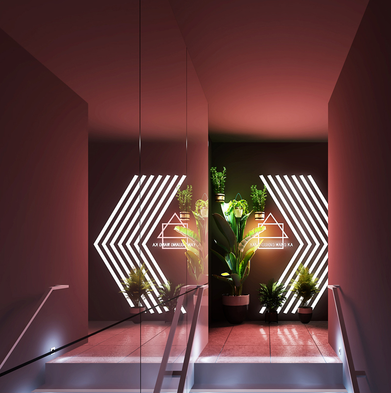 電競氛圍的營造不是單一的,而是無處不在。樓梯入口處醒目而又充滿趣味的燈帶指示標,巧妙的標識著空間的轉(zhuǎn)角,入門處便有一種電競感。