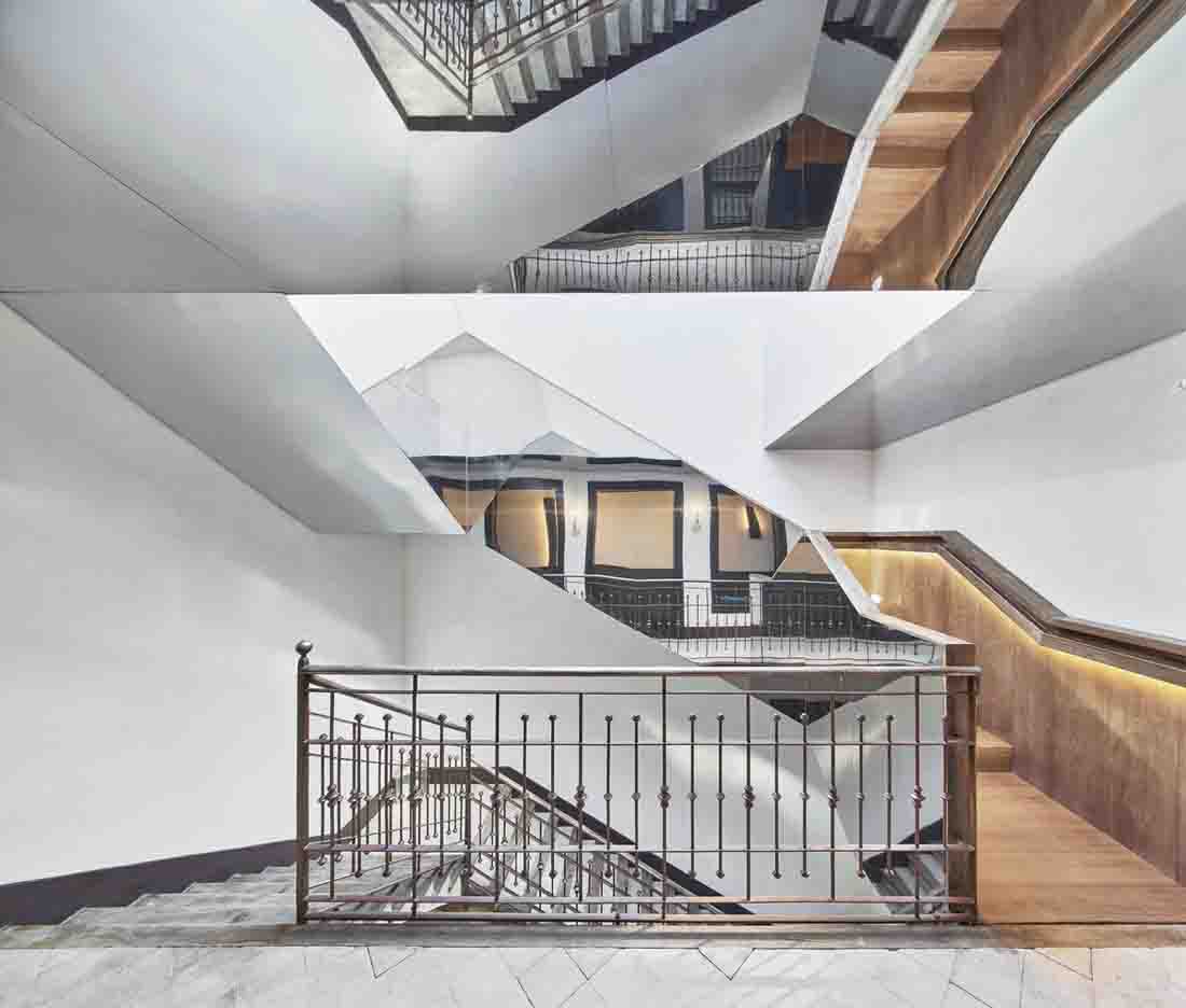 在主樓梯中,天窗被水淹沒,變成了一個帶有透明底部的小水池,在水中形成了光的活動,使樓梯上充滿了反射。
