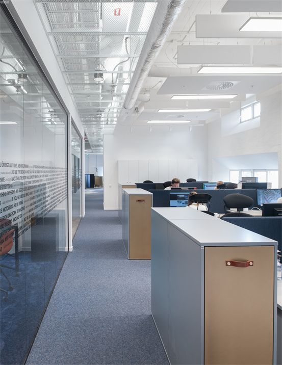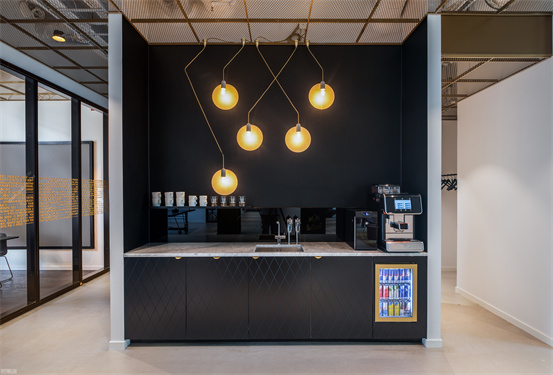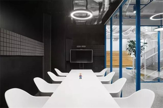 時尚與藝術(shù)并存的辦公室設(shè)計案例:整個空間設(shè)計手法簡約,原有建筑構(gòu)造和設(shè)備管線都展露無遺,色彩的巧妙構(gòu)筑讓這處極簡loft風(fēng)的辦公環(huán)境充滿了時尚的活力氛圍。墻面上充滿活力的圖案和一張乒乓球桌是視覺中的主角,而主入口就在這里。這里沒有傳統(tǒng)的接待臺,訪客進(jìn)入辦公室,可以為自己沖杯咖啡,然后進(jìn)入到內(nèi)部空間。入口處設(shè)有員工更衣室。辦公室的中央是一處大型演講廳,也是主要的活動場所。多功能演講廳配有看臺式階梯座、咖啡吧、屏幕和投影儀、講臺和所有其它必要的設(shè)備,即可以舉辦研討會、各種宣講,也是一處極為舒適的聚會場所。空間內(nèi)的照明設(shè)計非常獨特,采用了網(wǎng)格狀的矩陣布局,將所有燈具串聯(lián)在一起,形成精致的美學(xué)效果。整個空間形成一個明亮的背景,襯托出有趣的設(shè)計細(xì)節(jié)和墻面圖形設(shè)計。