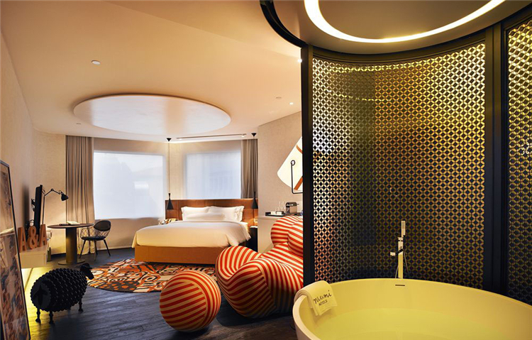 極簡主義風(fēng)格并沒有妨礙設(shè)計(jì)師為酒店創(chuàng)造豐富的主題元素,以花草、猴子、孔雀、青蛙等為主題的森林圖案,遍布鏡面、墻壁等區(qū)域,營造了精致的“城市森林”效果。