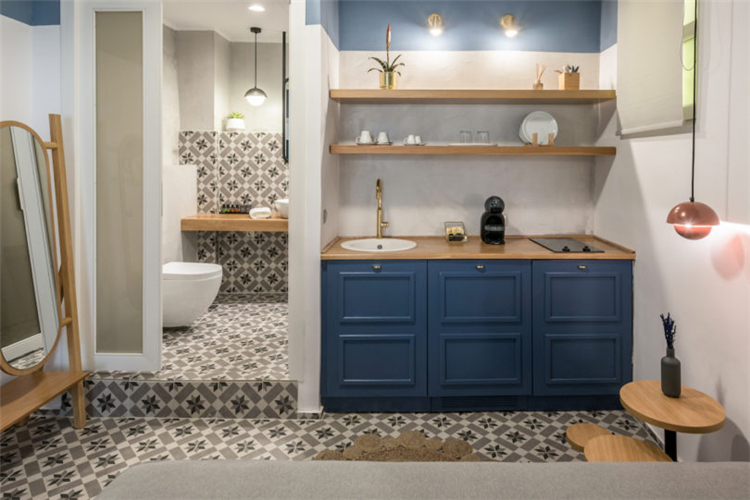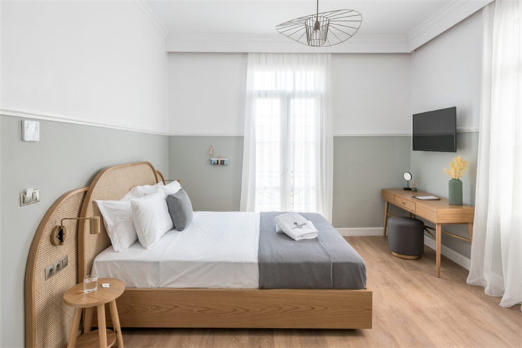 所有的地板都換成了天然橡木板和幾何水泥瓦。在整個客房中有一些小的現(xiàn)代細(xì)節(jié):如皮革墻壁掛鉤,極簡主義的植物增添了現(xiàn)代感。