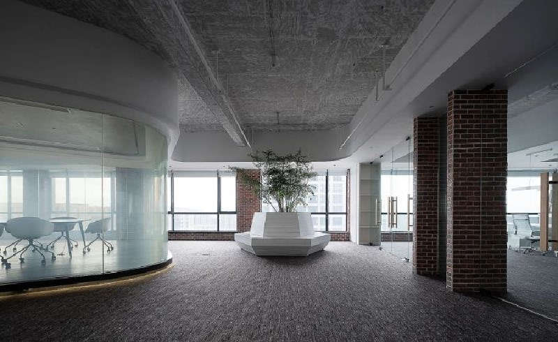 經(jīng)劃分,原本四方的整體空間,大致可歸為公共辦公區(qū)、獨立辦公室、黨建室、互動區(qū)、財務(wù)室、會議室、儲藏室、休閑室、檔案室及其他功能區(qū)域。拋去濃烈的墨黑,以灰、白作主色調(diào),既保持了沉穩(wěn)、大氣的理智感,又不使氣氛過于肅靜。前臺加入金色提亮,搭配大理石的紋理質(zhì)感,活波間亦不落俗,凈土之上雅致盡顯。在簡約現(xiàn)代的輕工業(yè)氛圍下,色彩、裝飾往往點到為止。紅磚墻與藤編椅的原生感,質(zhì)樸、不造作,在一片素雅的環(huán)境中,如曇花輕綻,為空間注入悄無聲息的生命力。