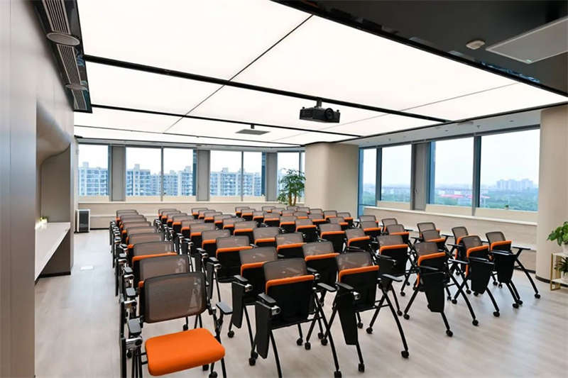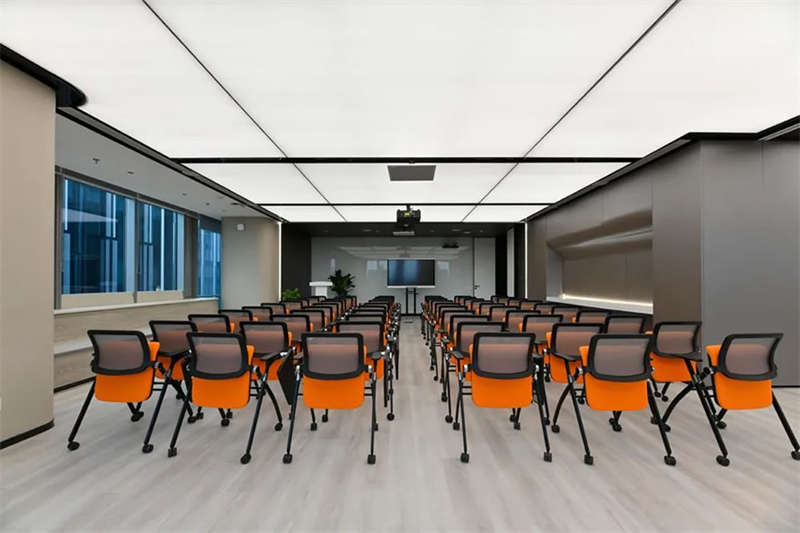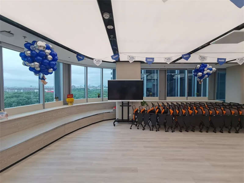 設(shè)計(jì)團(tuán)隊(duì)特意選擇了一處大型開(kāi)敞的臨窗場(chǎng)地,在酷炫的3D裸眼展示室旁邊打造出了一個(gè)4S店風(fēng)格的培訓(xùn)和茶水的二合一空間,以滿(mǎn)足客戶(hù)快速發(fā)展的團(tuán)隊(duì)培訓(xùn)和新品發(fā)布的需求。在臨幕墻的位置,設(shè)計(jì)師原來(lái)就設(shè)計(jì)了一排沿窗的休閑階梯造型臺(tái)階,后來(lái)因?yàn)橐咔榉揽氐男枨螅雅_(tái)階內(nèi)的空間利用好,平時(shí)內(nèi)部可以?xún)?chǔ)藏睡袋,防疫物資,帳篷等物品。