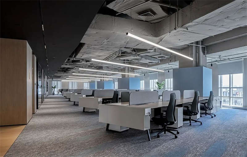 穿過會議區(qū)進入開放辦公區(qū)闊然開朗,色調(diào)由黑變淺,層層律動的地面紋理將蔚藍海洋天空的自然氣息引入到空間,律動的線性燈光交織輝映描述了Arm科技之源越過海洋略過山川的偉大之旅,植物和木色的點綴讓空間賦予對自然和科技的尊崇和平衡。