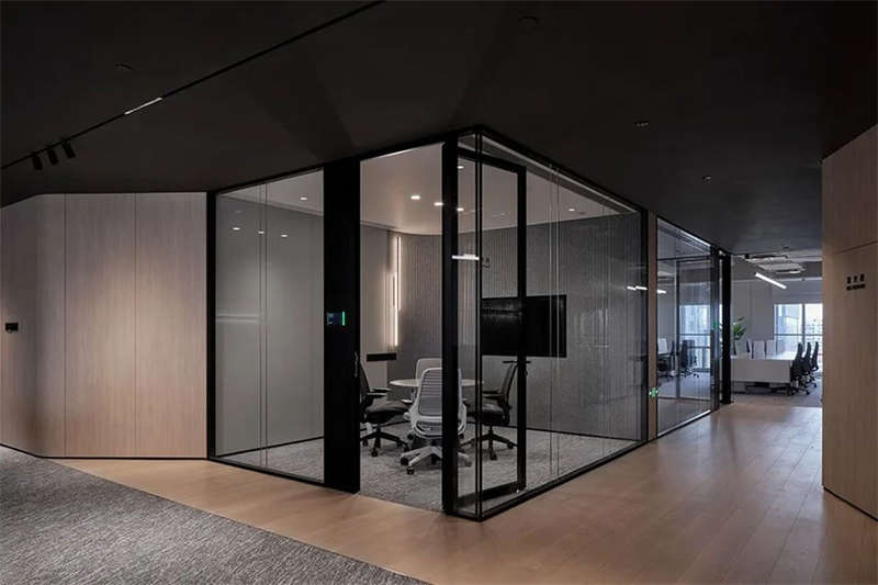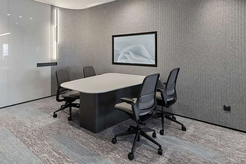 進入會議空間,設(shè)計師刻意控制它的視覺張力,前區(qū)的體驗得以延續(xù),灰黑色調(diào)覆蓋目力所及并引入更多的柔性材料,專業(yè)、專注是會議空間的功能立本但也不乏我們對活力元素的照拂,每一個會議室我們都選擇了形式各樣的藍色地毯來裝點。