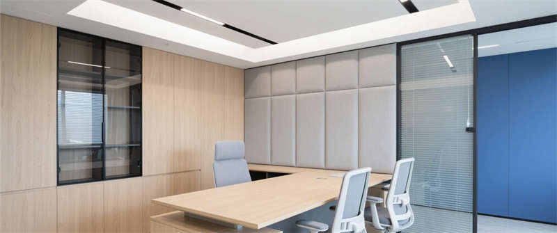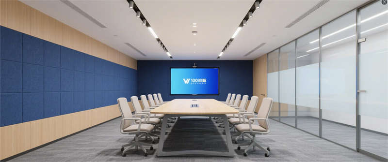 • 智能會(huì)議室:深藍(lán)色吸音墻面呼應(yīng)企業(yè)VI色,智能屏幕與玻璃隔斷凸顯科技屬性;