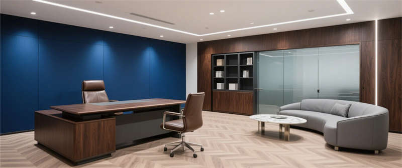 • 總裁辦公室:人字拼木地板與深胡桃木家具提升質(zhì)感,深藍(lán)藝術(shù)漆背景墻強(qiáng)化品牌識(shí)別;