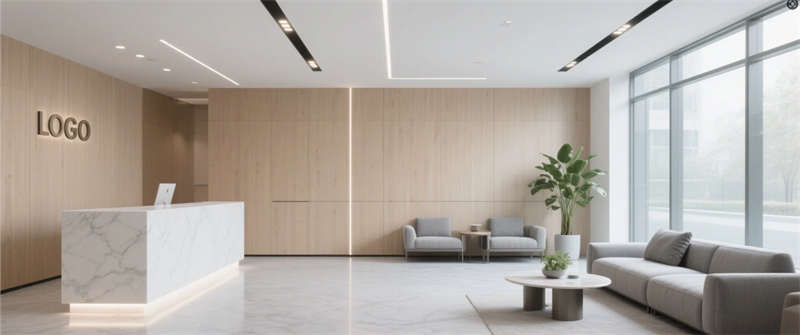 • 前臺(tái)大廳:淺木色LOGO墻與大理石接待臺(tái)奠定簡約基調(diào),線性燈光延伸視覺縱深;