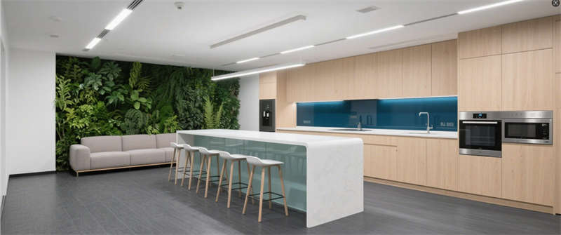 • 休閑茶水間:白色吧臺(tái)與綠植墻營造松弛氛圍,地膠材質(zhì)耐磨易清潔。