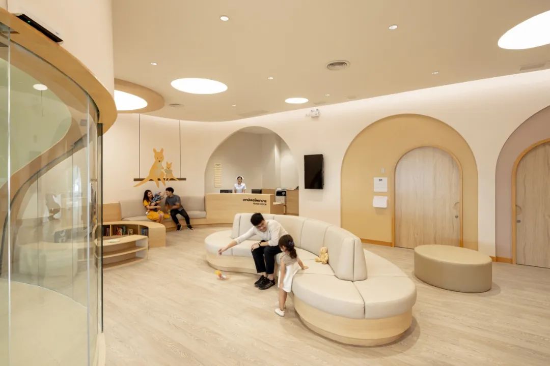 對于生病的孩子來說,富有趣味的內(nèi)飾才是關(guān)鍵,拱形門框讓看病成為一場趣味探險,消除了孩子與醫(yī)生間的隔閡。醫(yī)院的一樓和二樓都有兒童游戲區(qū)域,原本對于家長和孩子來說十分難熬的候診時間,便可以在這里悠閑的度過。當(dāng)然醫(yī)院內(nèi)也有專門的等候空間,不同于以往醫(yī)院中冷冰冰的不銹鋼座椅,柔軟的觸感、彎曲的造型都十分人性化。