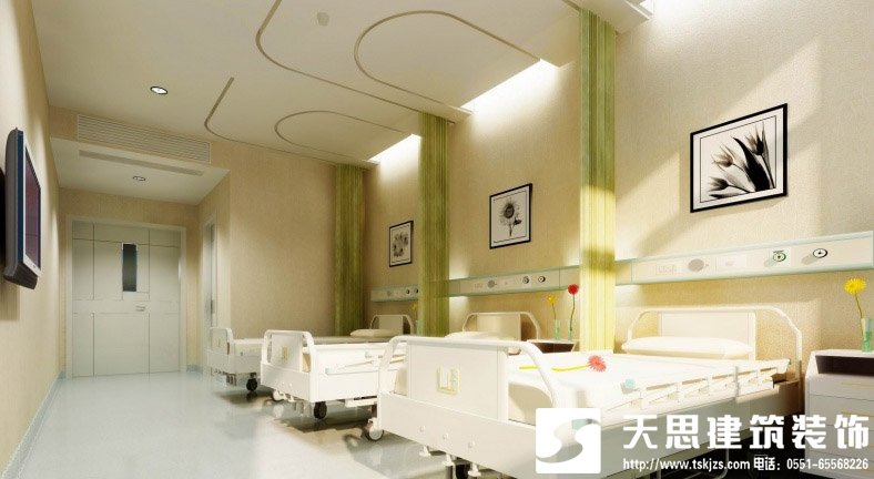 一般醫(yī)院多為一間病房有2~3間病床并配有衛(wèi)生間,病房門入口凈寬應(yīng)為1050mm,以保證單架車出入,門套應(yīng)能抗沖擊。壁柜按每床600mm即可。座便器選用后背懸掛式對清潔有利。床頭柜可用懸掛式。天花不易有多種造型,多用礦棉板或紙面石膏板。輸液架預(yù)埋龍骨。燈光應(yīng)多路控制。開窗為內(nèi)倒開為宜,以滿足通風(fēng)、安全防護、方便清潔三種需要。入門口玻璃要選擇透明無色。